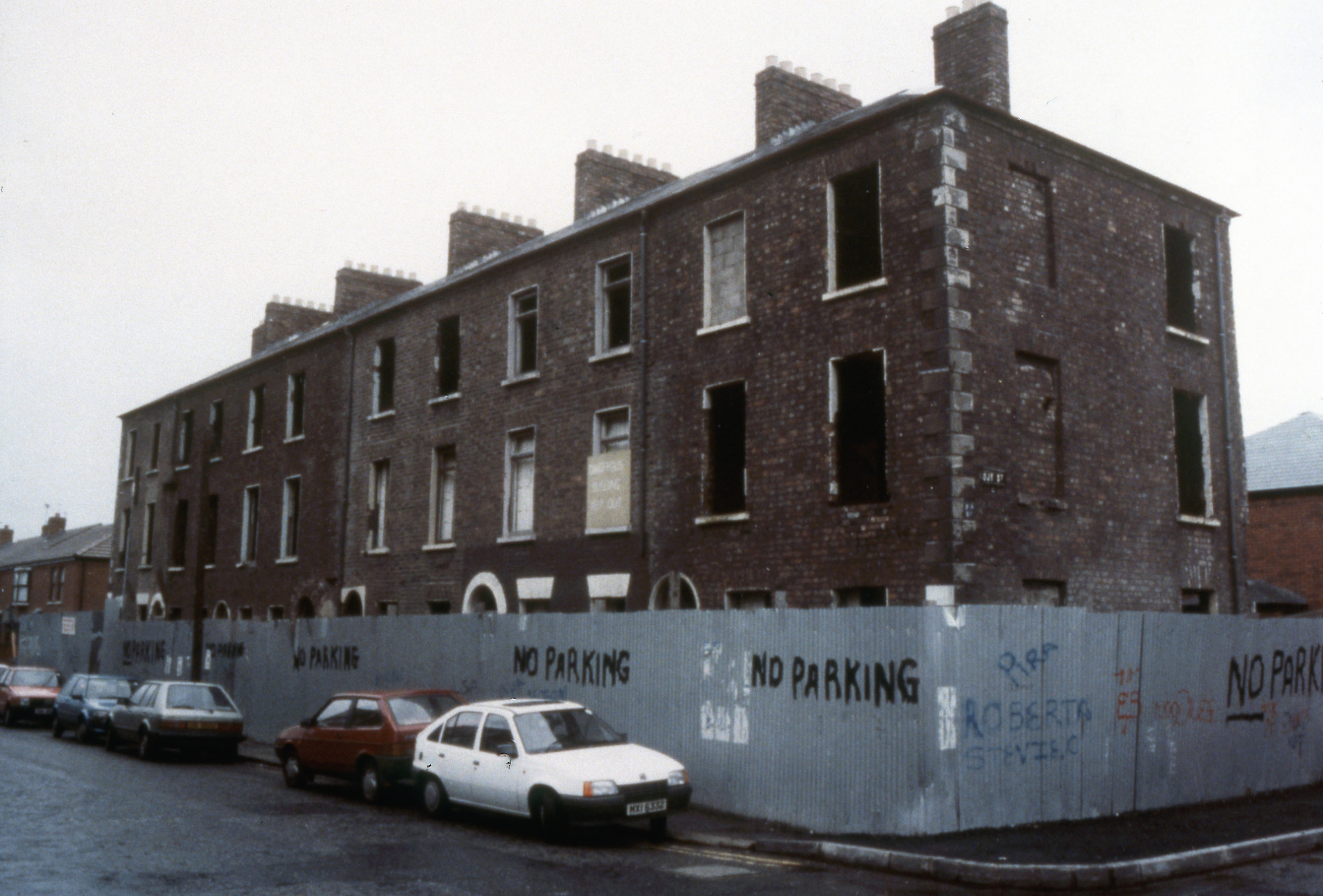 As Belfast’s linen industry started at the end of the 1820s, the town started to expand, and terraces of substantial merchants’ houses like this were built on new ground. Unfortunately, most were lost during the Troubles through redevelopment schemes or vandalism and subsequent dereliction. By 1988, the row at Hamilton Terrace was little more than a vandalised shell, its floor joists having been stolen, windows smashed, and with holes in every roof. Local redevelopment plans saw no alternative but to demolish these once-handsome homes.